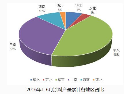 數(shù)據(jù)顯示,在上半年的涂料產(chǎn)量上,華東地區(qū)產(chǎn)量占比最大,達(dá)43.10%;中南、西南、華北、東北和西北產(chǎn)量依次占比達(dá)33.28%、10.18%、6.97%、3.97%和2.50%。增幅最大的地區(qū)是西北地區(qū)和中南地區(qū),并有推斷,這與甘肅與海南的增幅相對(duì)較大有關(guān)。