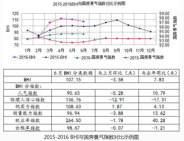 從“2015-2016BHI與國(guó)房景氣指數(shù)對(duì)比示例圖”中可見,2016年上半年國(guó)房景氣指數(shù)整體位于2015年上方,且2-5月逐月上漲,6月國(guó)房景氣指數(shù)微跌(2015年2-5月逐漸走低,6月止跌微升)。進(jìn)而分析2016年上半年,全國(guó)樓市在“去庫存”的大背景下,房地產(chǎn)政策偏向?qū)捤桑禍?zhǔn)降息、調(diào)整首次置業(yè)首付款比例等購房層面刺激政策接連出臺(tái),不斷刺激房地產(chǎn)市場(chǎng)需求釋放,樓市上半年整體呈現(xiàn)量增價(jià)漲格局。