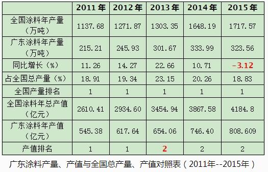 廣東涂料產(chǎn)量、產(chǎn)值與全國(guó)總產(chǎn)量、產(chǎn)值對(duì)照表(2011年--2015年)
