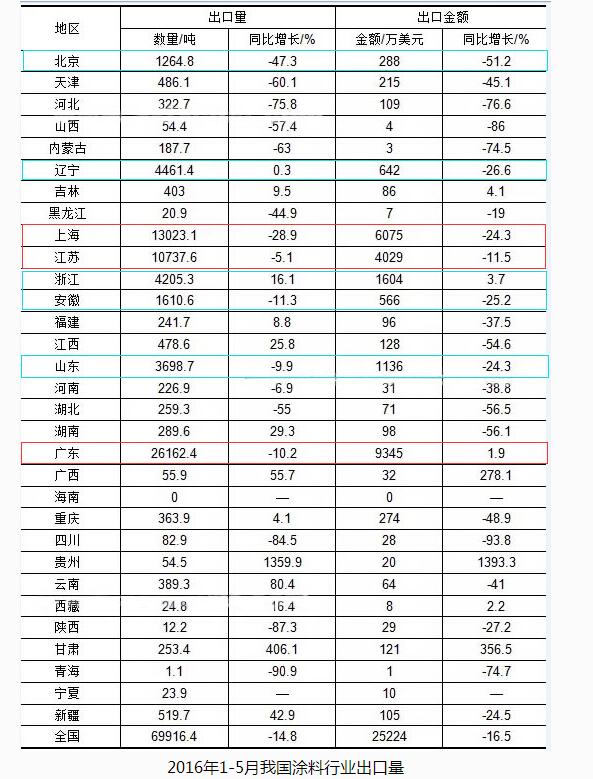 第一,廣東、江蘇和上海作為涂料大省,從最新地區(qū)涂料行業(yè)出口量數(shù)據(jù)來看(下圖),2016年1-5月我國(guó)涂料行業(yè)出口量累計(jì)達(dá)到6.99萬噸,同比下降14.8%,出口金額累計(jì)2.52億美元,同比下降16.5%。雖然出口量整體呈現(xiàn)不同程度的下降,但整體看,廣東、江蘇和上海仍舊是出口大省,出口數(shù)量在萬噸以上。